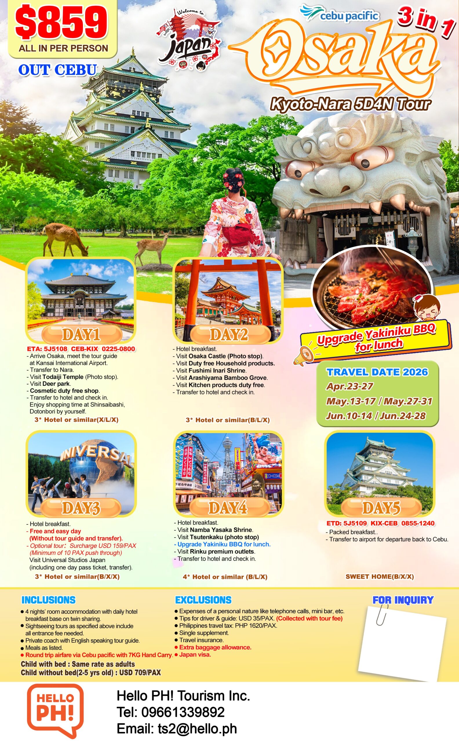 5 Days & 4 Nights at Osaka, Kyoto, and Nara! Day 1 is already a full day visiting Nara. Day 2 is a tour in Osaka. Day 3 is a FREE DAY (Perhaps add-on a trip to Universal Studios?) Day 4 more spots to visit and lunch at Yakiniku BBQ. Day 5 is departure back to Cebu.