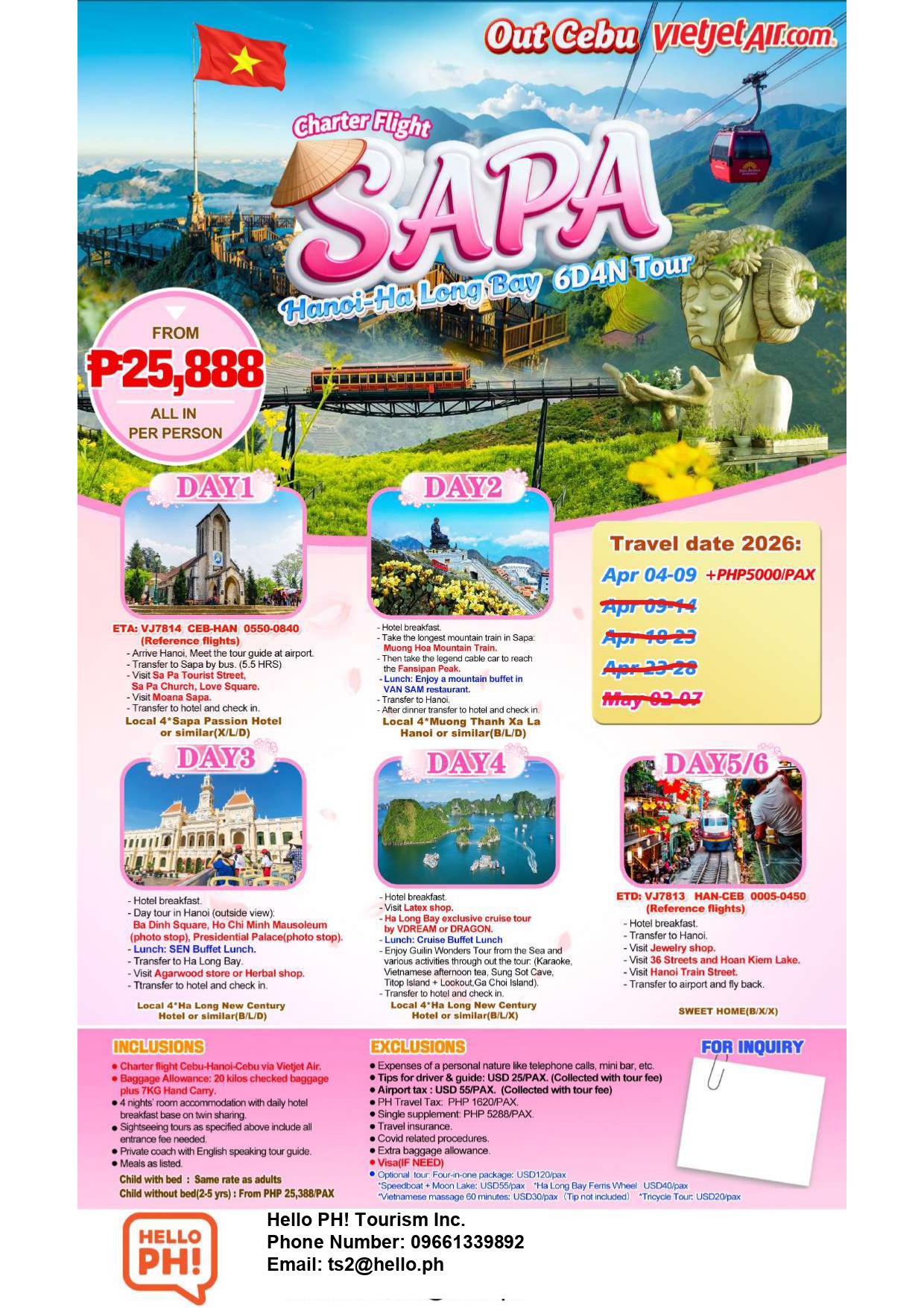 - 04-09 APR (Add PHP 5,000/pax has surcharge)